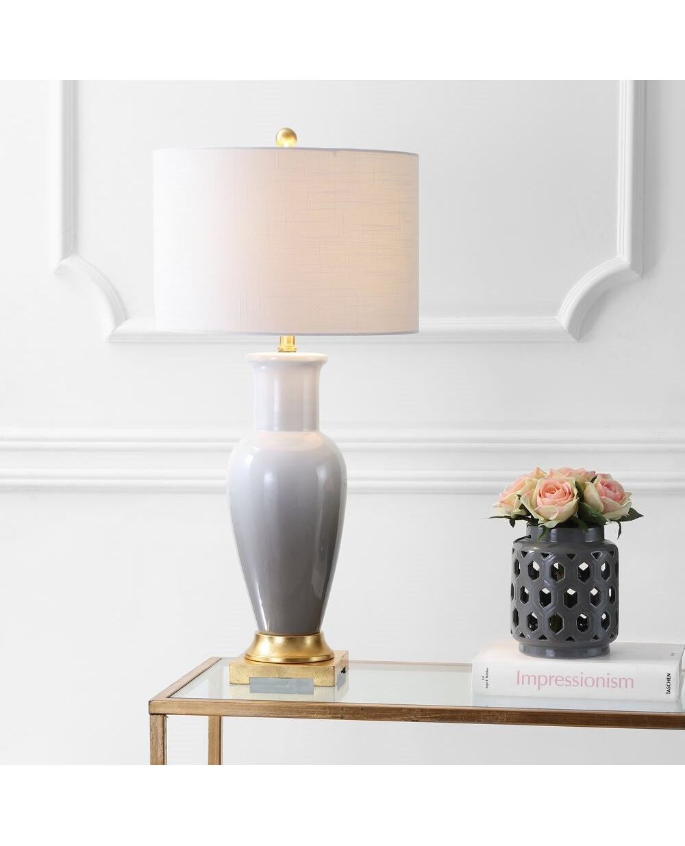 Dip-dye, shibori, and gradient washes are some of the hottest trends in fashion, and this lamp perfectly translates the same look for the home. With a gray base that transitions to white, a modern glaze technique is made traditional by the addition of a brass pedestal and accents. Topped with a matching finial and cotton drum shade, this style-centered moment is sure to be an instant classic.