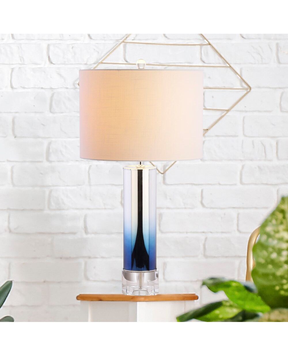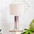 A decorative cutout center column is enclosed in an ombre rose-colored glass effect in this stylish contemporary table lamp. With an elegant, round crystal pedestal base, and topped with a drum shade in white linen fabric, every design detail from finial to plug has been considered for maximum style. Fashion meets function also -- this lamp is compatible with LED, CFL, and Incandescent bulbs.