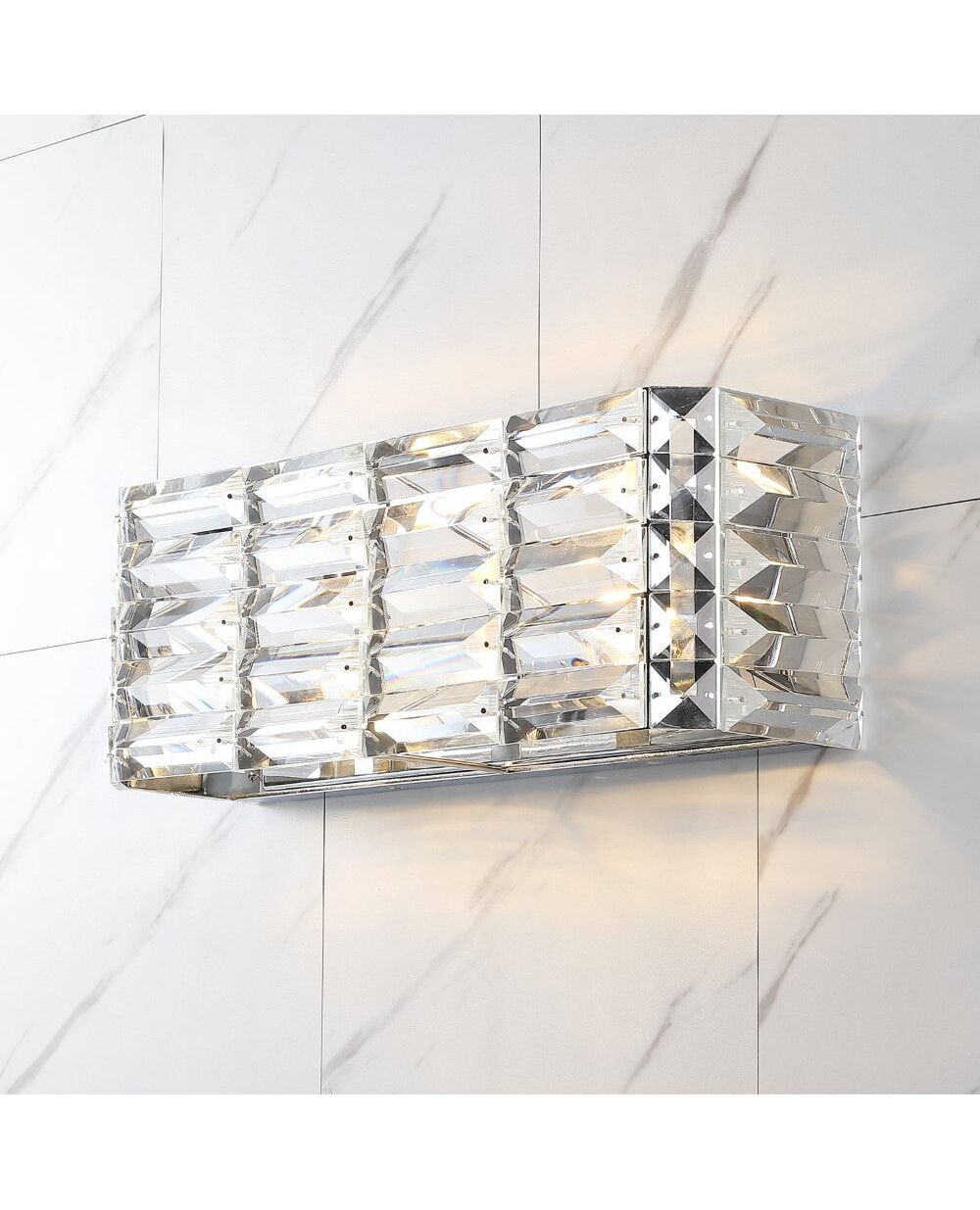 Crystal prisms are set like jewels into a long, glamorous vanity light with mid-century flair. Add vintage glam over a sink or vanity, for an Art-Deco-inspired bathroom. A sparking chrome finish makes this light perfect for contemporary bathrooms too.