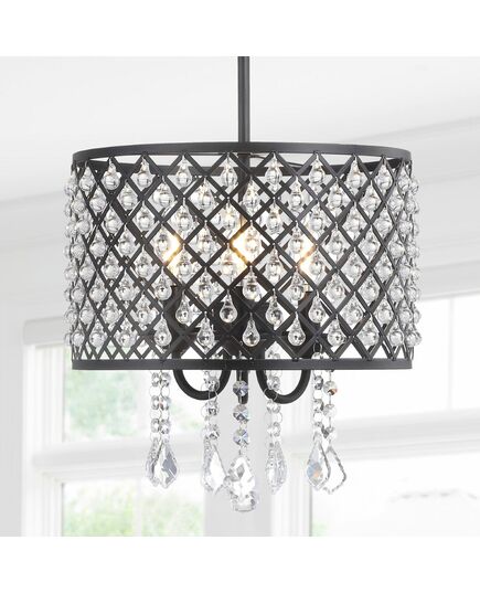 The clean lines and graceful accents of these crystal and wire frame hanging fixtures make them suitable for any room in the house, especially a kitchen, living room, or foyer. The cylindrical frame features a clever cross-hatching detail around the main body, available in an industrial black finish. It hangs from a disc mounting plate with a matching rod. At the apex of each cut-out diamond hangs a clear crystal that gives this otherwise straightforward design a touch of glamour.