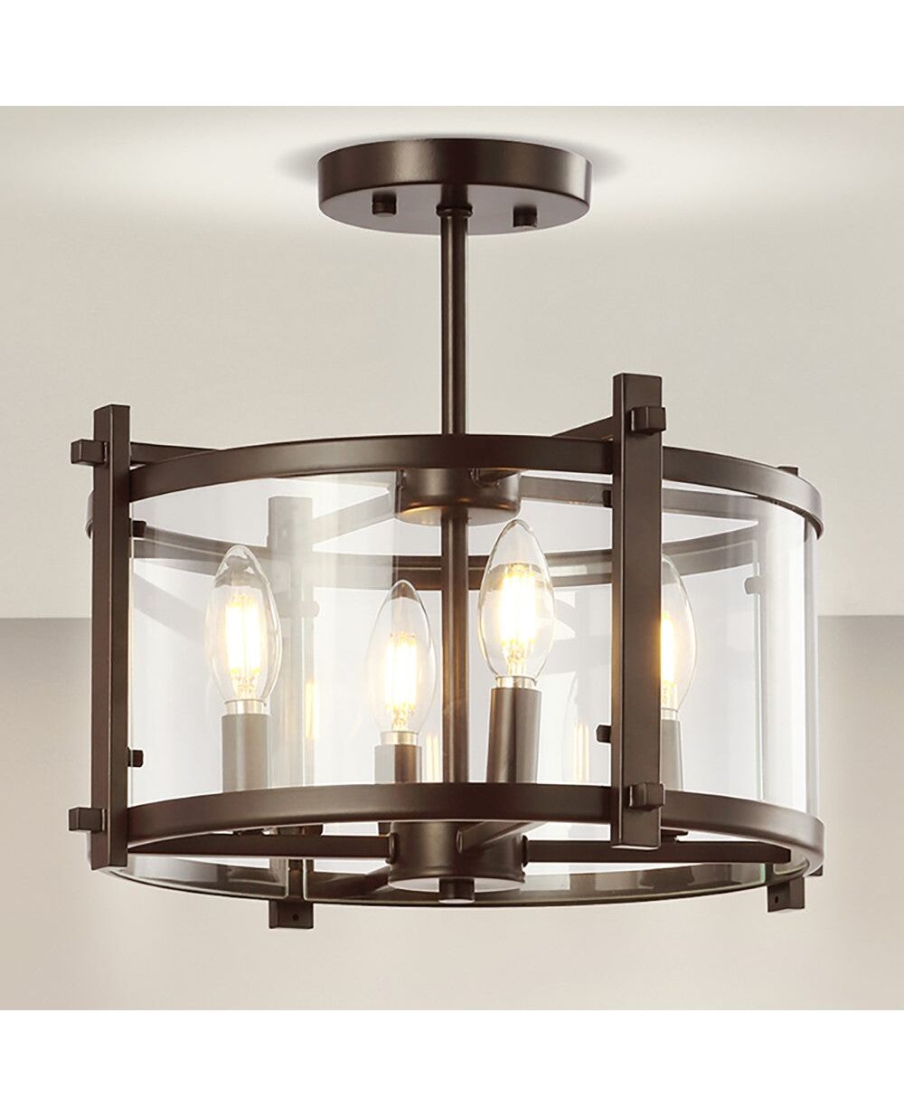 Whether your home is Rustic or Traditional, the classic drum shape of this semi-flush ceiling light fits right in. Clear glass side panels are framed in black metal with a handcrafted look. This ceiling fixture is perfect for an entry, kitchen, living room, hallway or bedroom.