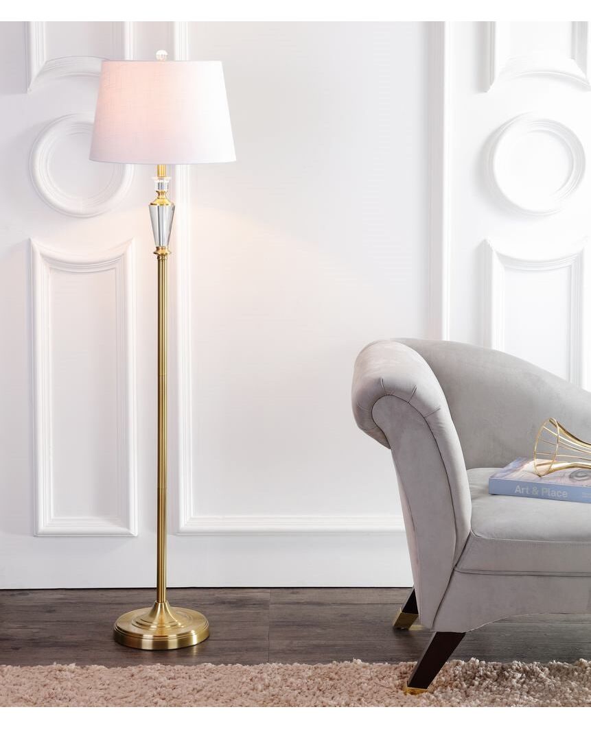 Supported by a round pedestal base, this gleaming brass floor lamp shows off a slender body that's punctuated with a classic faceted crystal detail. A crisp cotton drum shade and silk-wrapped cord complete the piece. Great for extra reading light next to a sofa or chair, or to bring light to a dim corner.