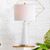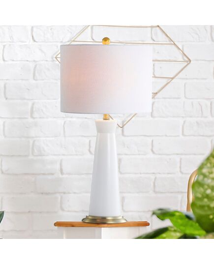 Resting on an elegant brass base, this tapered column table lamp features a soft white glaze. Ceramic construction perfectly complements a, oblong hourglass silhouette to bring eye-catching flair. A linen tapered drum shade and silk-wrapped cord complete the look.