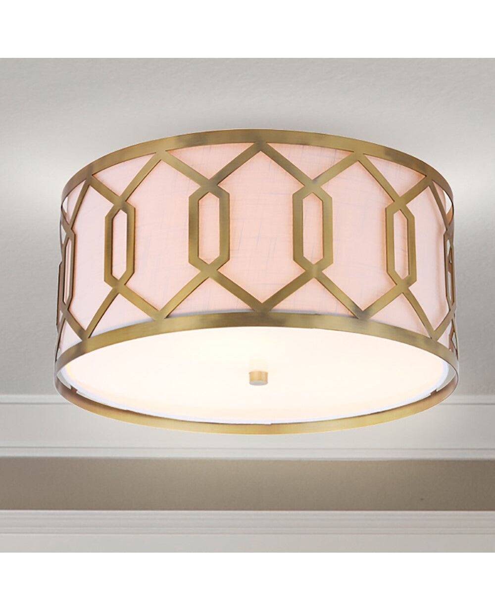 Featuring a wonderfully warm satin brass finish, this 3-light ceiling flush mount is a stylish addition to a living area or bedroom. With only 9" of drop, this is a flush mount design ideal for high or low ceilings. A linen shade is complemented with a geometric fretwork of overlapping hexagons that adds a decorative touch to any interior.
