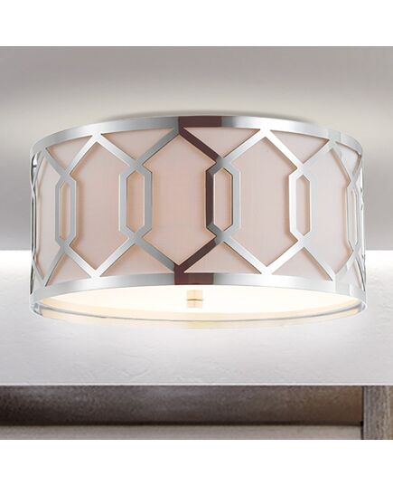 Featuring a wonderfully warm satin brass finish, this 3-light ceiling flush mount is a stylish addition to a living area or bedroom. With only 9" of drop, this is a flush mount design ideal for high or low ceilings. A linen shade is complemented with a geometric fretwork of overlapping hexagons that adds a decorative touch to any interior.