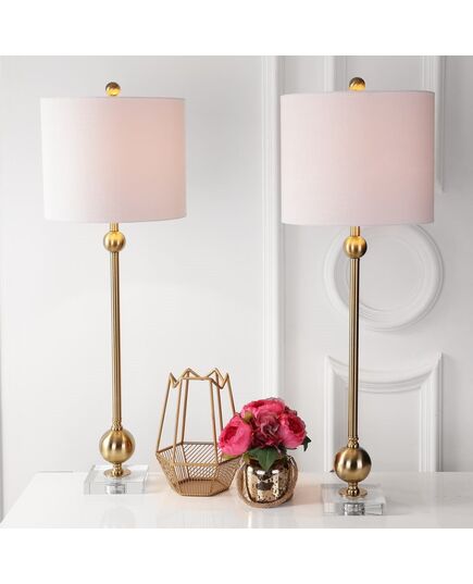 In the 1960s, when details on the space race headlined the cover of every magazine and the Russian's sputnik satellite inspired a whole movement in futuristic home décor, rod and ball construction really had a moment. We've revived the best of that construction and plated it in a modern brass finish so that it simultaneously harkens the past and beckons to the future. Situated atop a clear base, the combination of metal and crystal paired with a cotton drum shade make for a versatile piece that will last for decades to come.