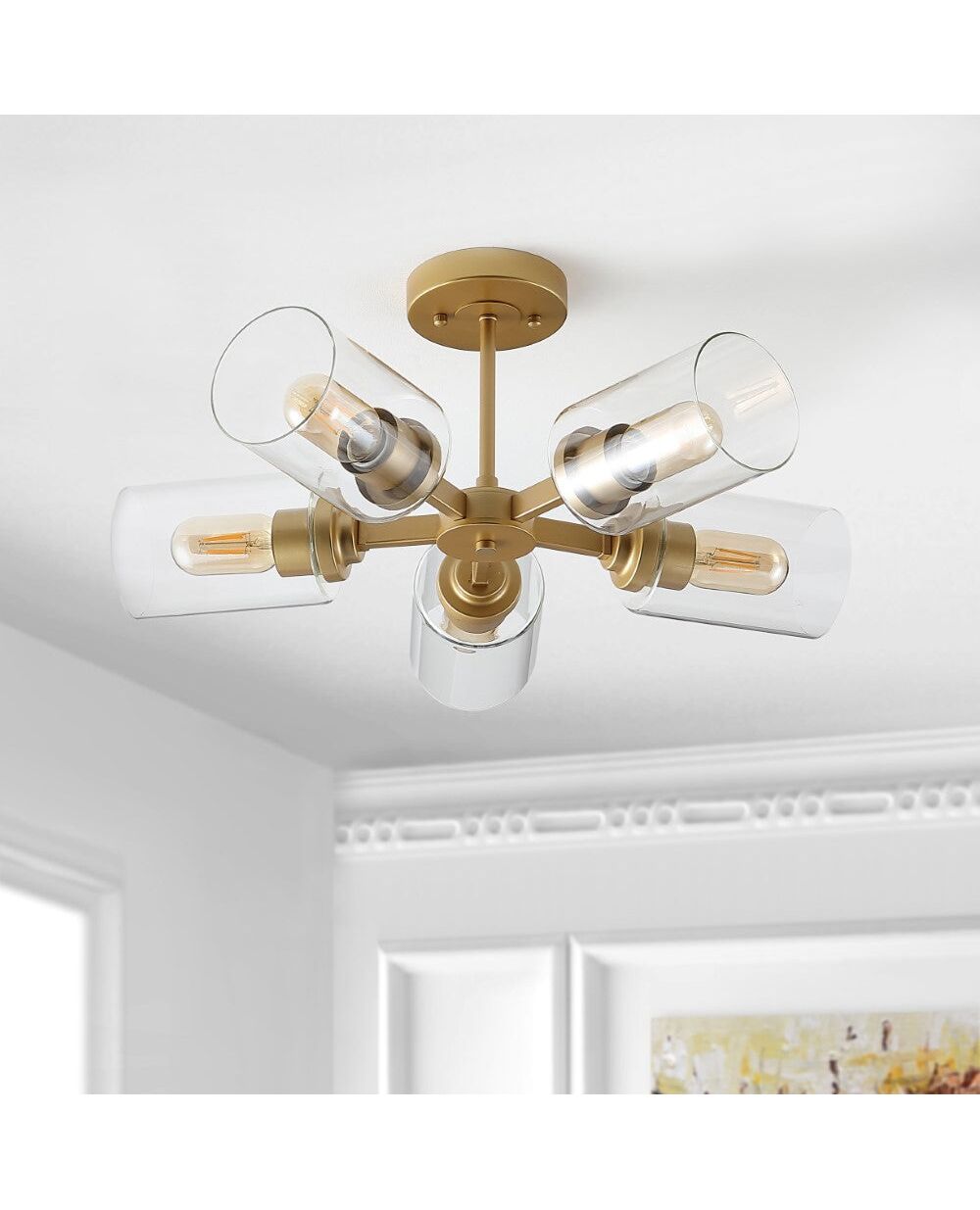 Add vintage glam to your space with our trendy industrial-style ceiling fixture. Five Edison-style LED bulbs are encased in clear glass cylinders to provide plenty of light. Horizontal lines and a gold finish add a modern glam touch to a kitchen, living room, bedroom, or entry.