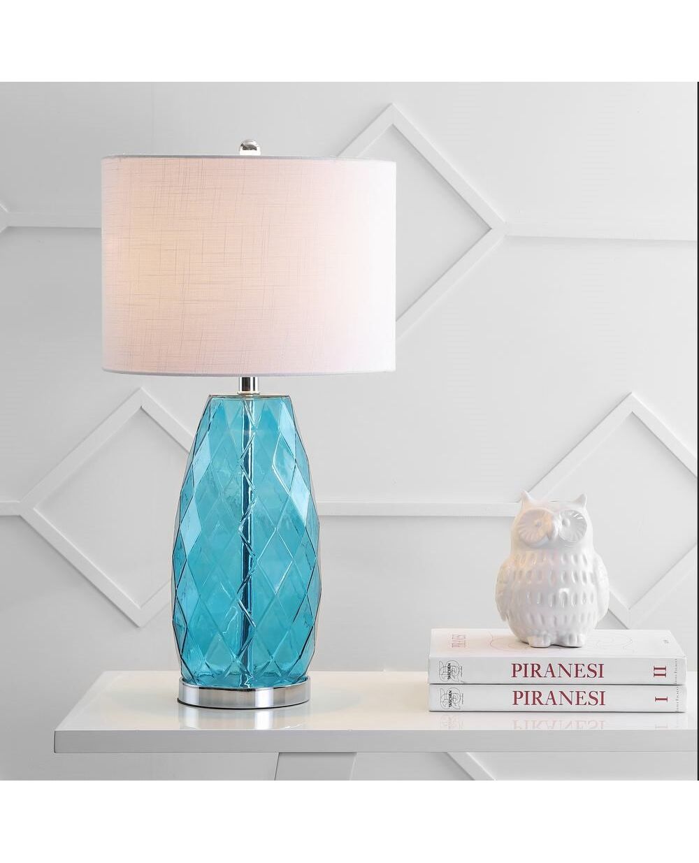 A light tint of gray emphasizes the beautifully faceted shape of this glass table lamp, reminiscent of precious gemstones. Subtly stylish and simultaneously classic, the chrome base and finial add modern touches to an elegant base. We love how the designer touches extend all the way to the plug with a silk-wrapped cord.