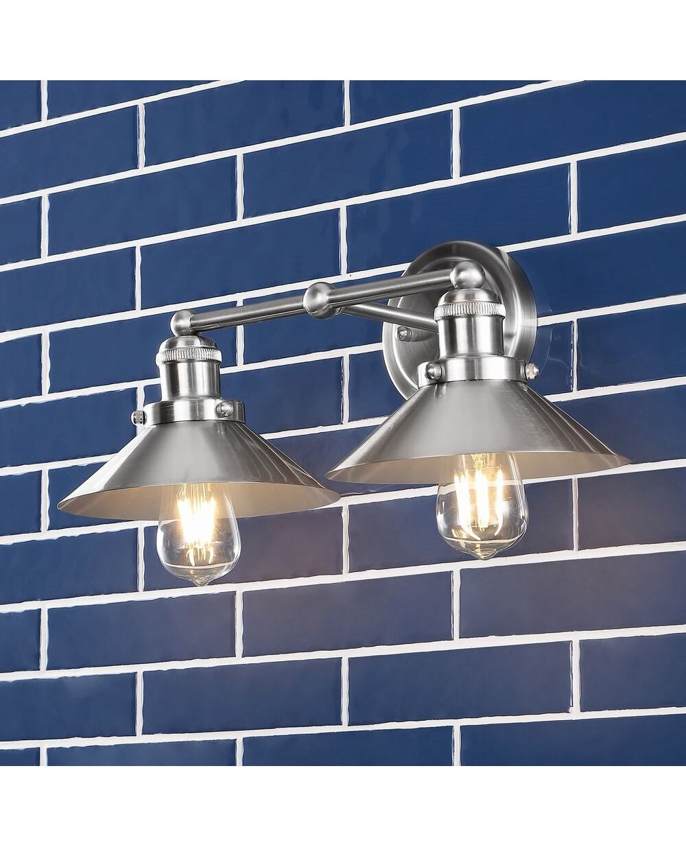 Like a classic barn light but in a modern shape and smaller scale, this classic design features a metal cone shade that conceals the top half of the bulb -- perfect for a clean, industrial look. In a matte nickel finish, this sconce is perfectly at home on either side of a bathroom mirror or as extra lighting in kitchens, where your hardware truly shines. Also available in multi-light configurations, the geometric shape adds elegant interest to any space.