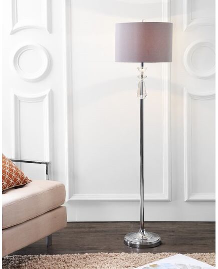 Perfect for rooms with a moody, neutral color scheme in need of a pop of glamour, this floor lamp delivers a lot of style in a classic shape. Accented with a trio of faceted crystal objects at the neck of the base, it is completed with a grey drum shade and chrome body. The crystal finial ties the look together and is seemingly illuminated when the bulb is lit.