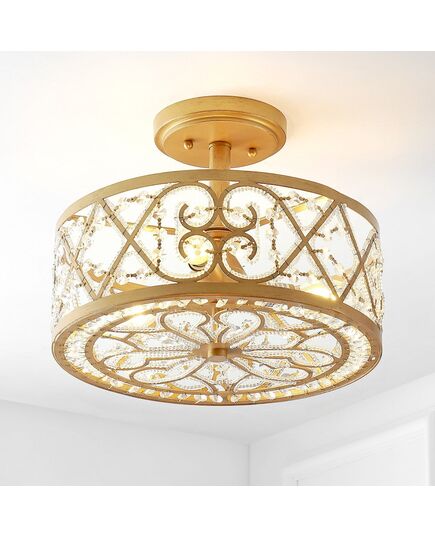 Add drama and sparkle to your ceiling with our modern, feminine semi-flush light fixture. Crystal beads define the scrolls of a gold filigree metal drum shade. This light fixture is a glamorous addition to your hallway, bedroom or bathroom. Three dimmable LED bulbs provide plenty of light.