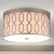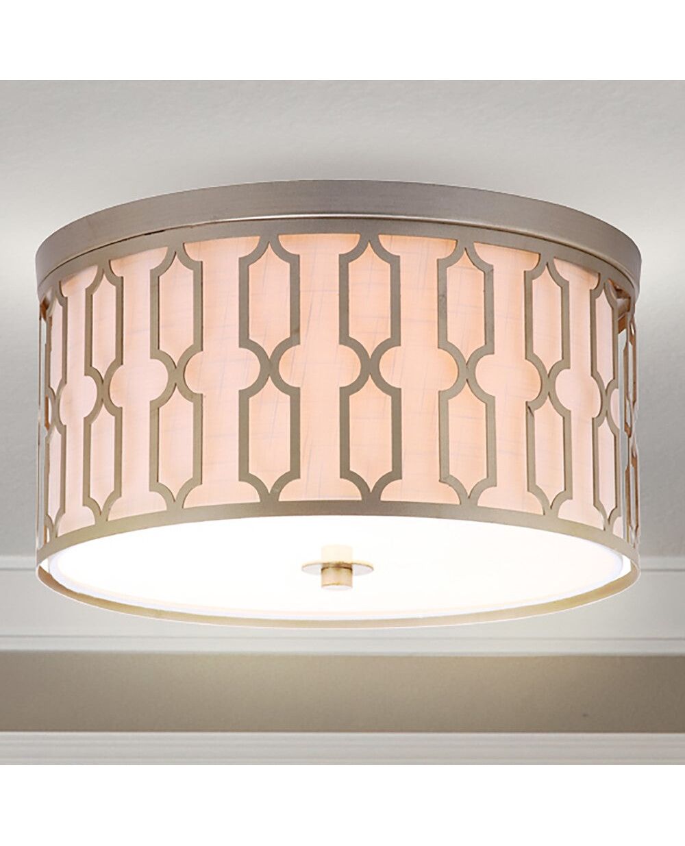 A delicate, linked geometric metal frame surrounds a round white linen shade in this iron-finish flush mount ceiling light. The glow of its three bulbs highlights the intricate fretwork of the link design. This lux transitional look would work well in both high and low ceilings and with any style of decor.