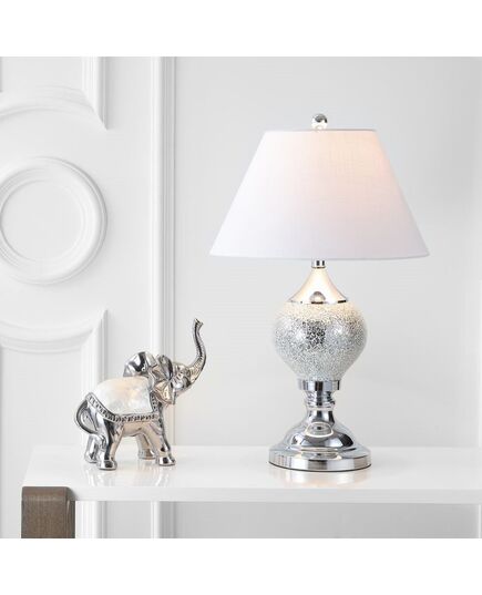 If your style toes the line between traditional and glam, than this curvy chrome lamp is likely up your alley. With a mosaic of mirror fragments hand-applied to the body, the shine is carried through to the chromed base and finial, where you're sure to love the disco ball effect that occurs when the light reflects of the many gleaming components. A linen tapered shade adds a casual touch to this statement-making piece.