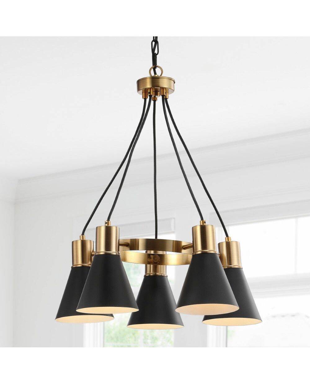 With 5 conical shades connected by a copper ring and individual chains, this stunning pendant would also suit as a chandelier. In matte black and polished brass, the color combination is bold and modern, though versatile. With 5 bulbs that are LED compatible, you'll get ample light for very little energy -- savings for you and the earth.