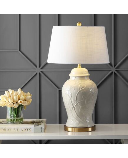 Our modern take on Chinoiserie features a solid cream glaze on a sculptural botanical design. This large lamp is perfect for a bedroom, living room, or dining console. The traditional ginger jar shape exudes Hollywood Regency style, while the empire shade suits modern interiors.