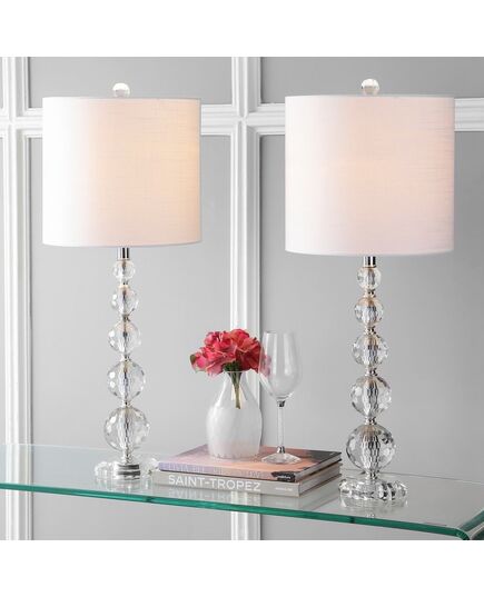 Modern yet timeless, the graduated sizes of the faceted crystal orbs on the base of this 28.5" high table lamp will brighten any corner with style and light. At nearly 30" tall, you'll make a statement by adding a perfect pair on either side of a console or buffet, or use one to give your desk a designer touch with this updated take on a classic style. Crafted of a lead crystal base and finial, it's finished with a bright white drum shade and silk-wrapped cord.
