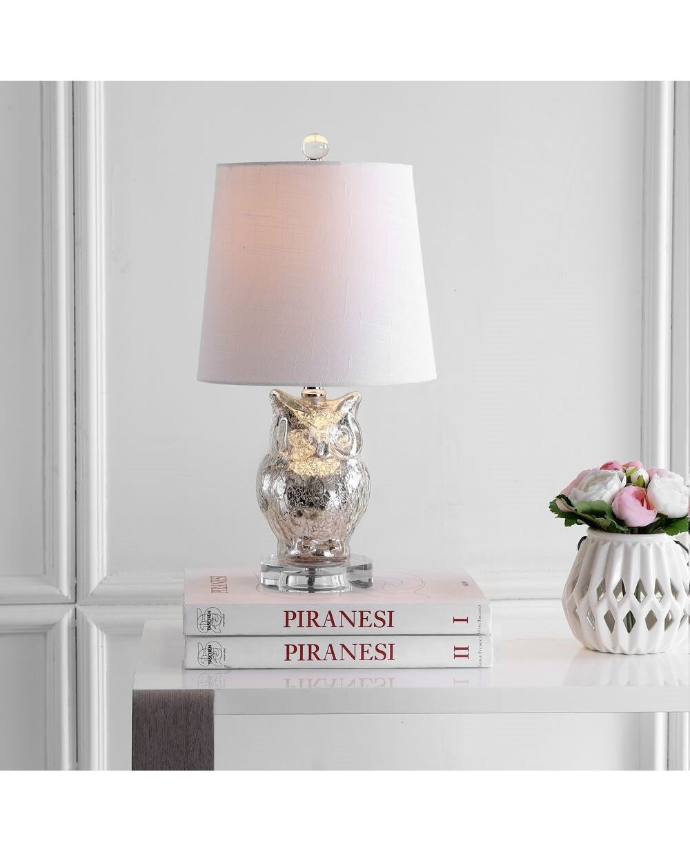 With intricate detail, this owl-shaped table lamp is bound to be a hoot in your home. Made of glass with an attractive silver finish, this lamp will be a unique and charming addition to any perch whether in a living space or bedroom. We especially love the crystal base and finial, and the silk wrapped cord -- designer elements that make this item a collector's piece!