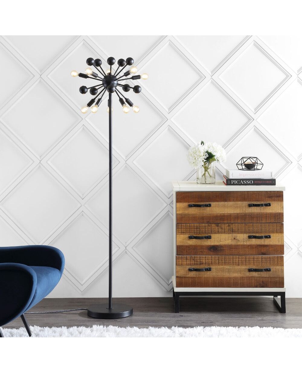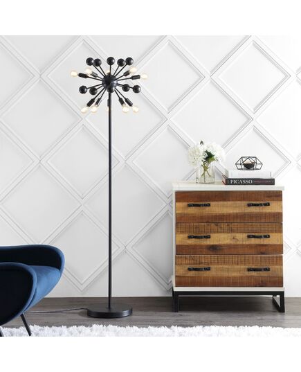 Create a mid-century mood with the dramatic black silhouette of our retro-modern floor lamp. Inspired by industrial design and atomic-age style, the sputnik lamp is both lighting and sculpture. It features 10 vintage-style LED bulbs and a foot-step switch. The black satin metal finish is complemented by a silk-wrapped cord.