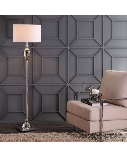 Classical style meets contemporary elegance in this polished nickel floor lamp with a bright white drum shade. Typically used as a silhouette for table lamps, the Grecian urn accent adds an old world element to this functional silhouette. At 62" tall, it is the perfect height for beside a sofa or between a pair of club chairs.
