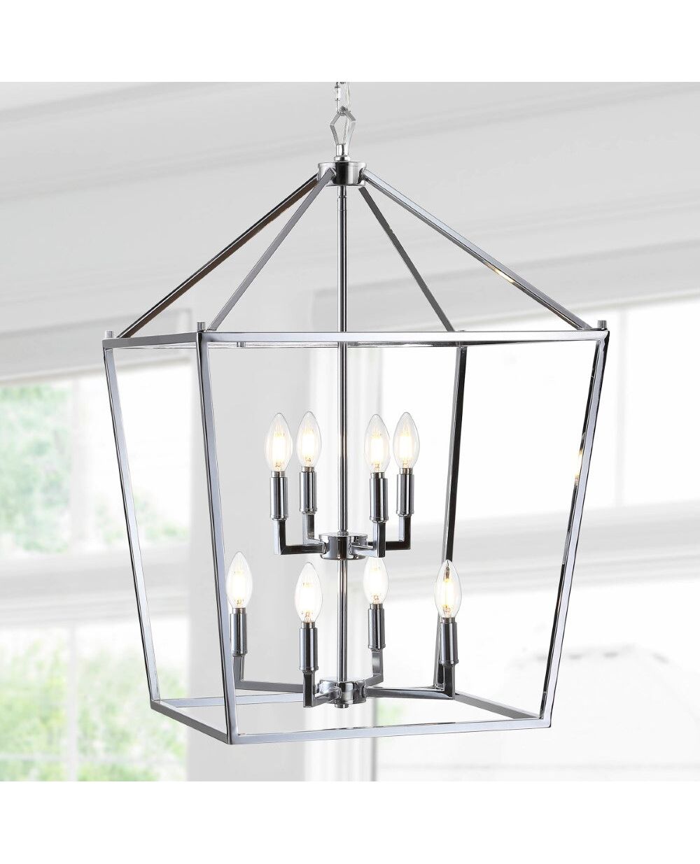 This classic lantern pendant light features a metal caged frame of negative space with exposed bulbs that illuminate from within the center. The shape of the fixture is inspired by iconic street oil lanterns. The pendant light suspends from a chain link that is adjustable to allow the fixture to hang only 34"down, or up to 106" from your ceiling, where it anchors with a round metal canopy.