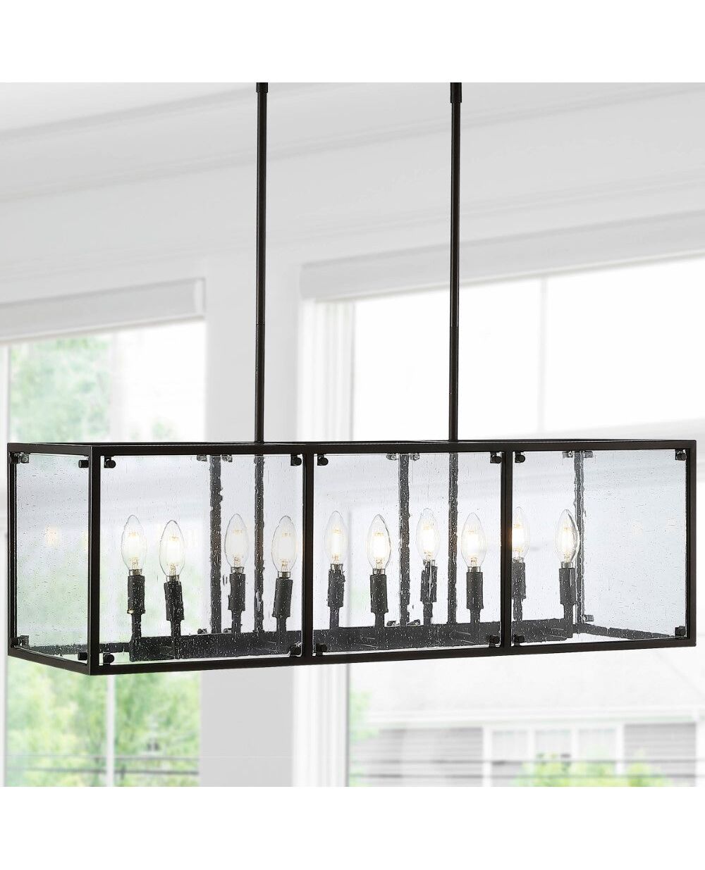 Perfectly sized for an oversized kitchen island, long kitchen table or dining room, this pendant lantern is linear and modern. The simple black metal frame features ten Edison-style LED bulbs for an industrial touch. This versatile linear pendant is ideal for modern, minimalist dining rooms as well as rustic farmhouse spaces.