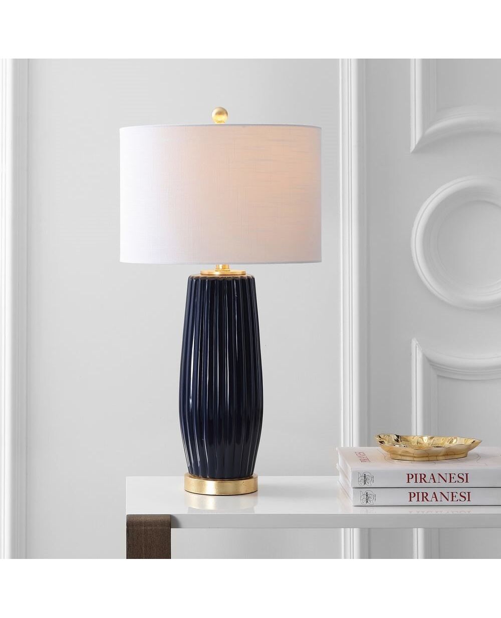 Add the finishing touch to any room in your home with this lovely fluted ceramic table lamp. Atop a brushed brass base, a solid coating of navy blue glaze gives this ribbed shape a high-gloss finish. Topped with a linen hardback drum shade and paired with brass fittings, the style extends all the way to the plus with a silk-wrapped cord.