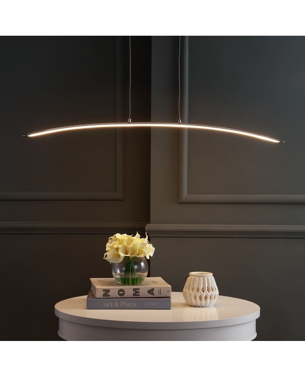 A single, curved line is suspended by clean lines in this sleek pendant. An easy addition to a contemporary space, this piece features an adjustable drop and an integrated LED light. Perfectly suited to hang over a kitchen island or dining area.