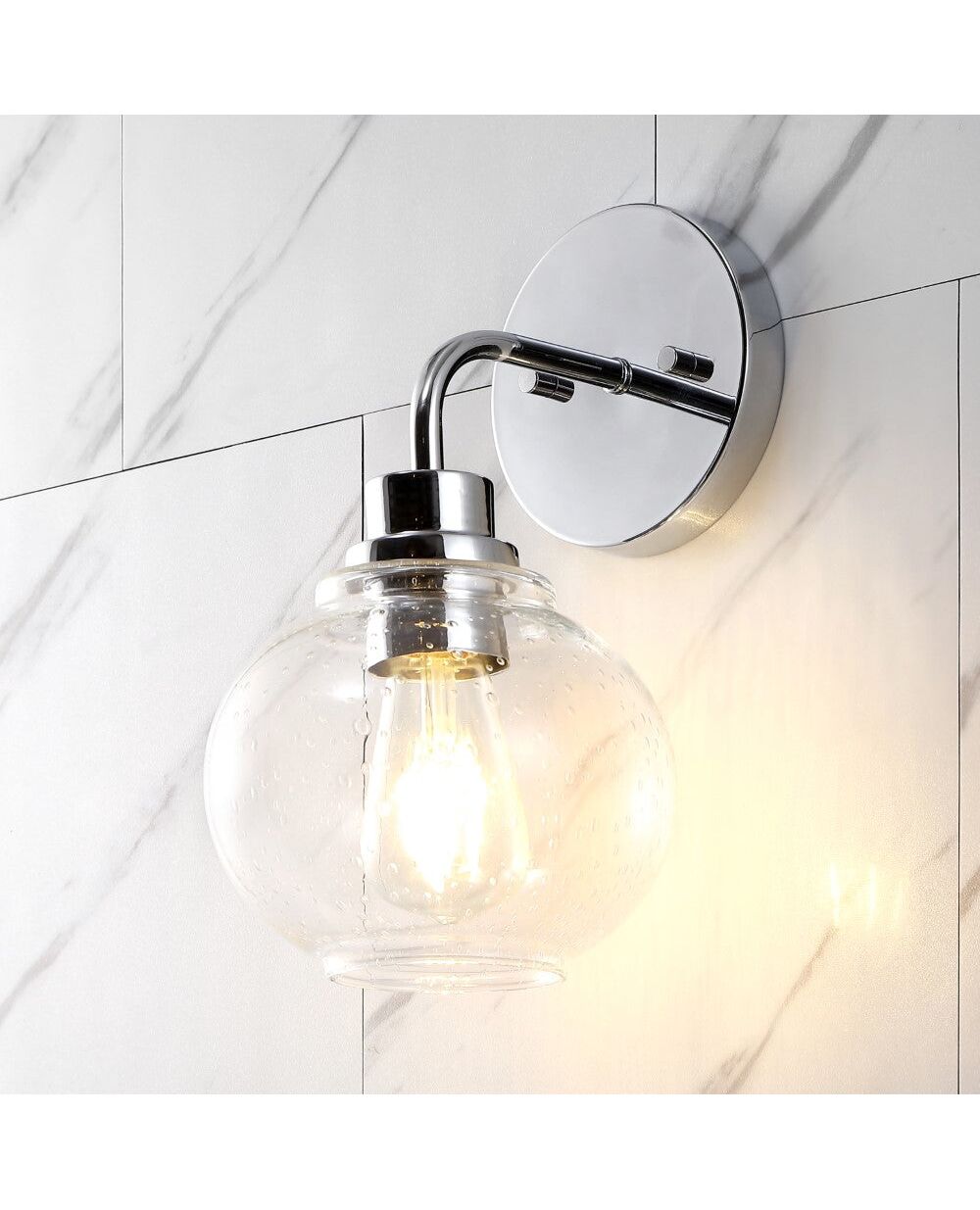 Bring on the vintage Parisian flair with our bistro-inspired wall light. A single LED bulb in a clear glass globe provides plenty of light. Clean lines and a sparkling chrome finish add modern French style to your bath vanity, kitchen, hallway or entry.