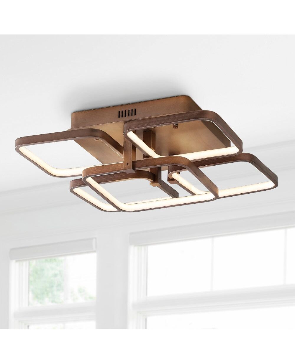 Often flush mounts are overlooked by designers, selecting something simple and often muted. We're turning that paradigm on its head with this statement-making geometric design featuring integrated LED lights. Layers of squares with rounded corners all illuminate from within (no more changing lightbulbs!) creating a stunning glow on a coffee-colored metal frame.
