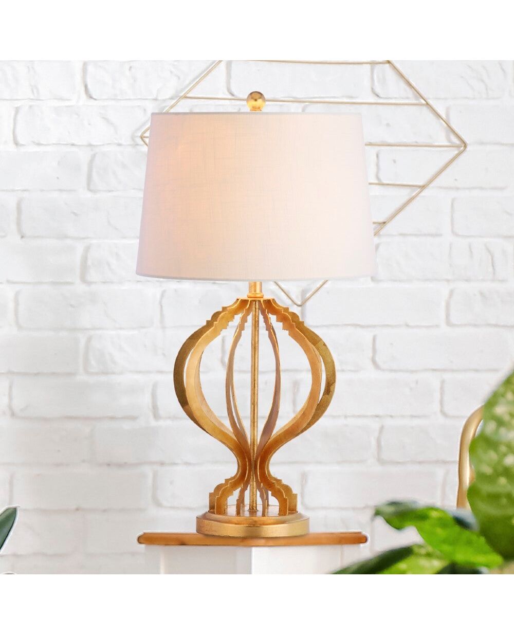 With a design motif taken from the runways, this shape is inspired by a trellis design featured in many of this season's hottest prints. Finished in a hand-applied gold leaf, this elegant lamp would add a warm glow and transitional design element to any space. With and matching finial and slightly tapered drum shade, this table lamp stuns with perfect scale and metallic neutrality.