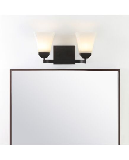 The squared lines of this 2-light vanity fixture give it a pared-down traditional look. A soft black finish and flared shades add low-key vintage style over a bathroom mirror. Frosted glass provides soft, diffused light from the bright LED bulbs.