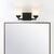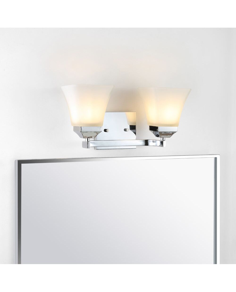 The squared lines of this 2-light vanity fixture give it a pared-down traditional look. A soft black finish and flared shades add low-key vintage style over a bathroom mirror. Frosted glass provides soft, diffused light from the bright LED bulbs.