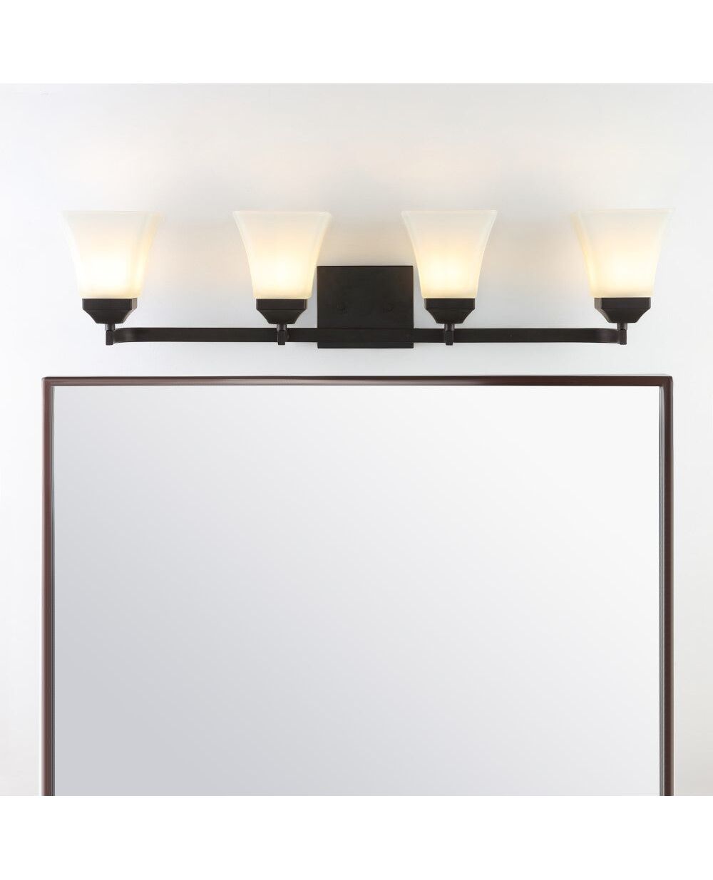 The squared lines of this 4-light vanity fixture give it a pared-down traditional look. A soft black finish and flared shades add low-key vintage style over a bathroom mirror. Frosted glass provides soft, diffused light from the bright LED bulbs.