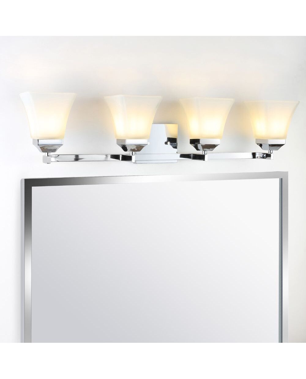 The squared lines of this 4-light vanity fixture give it a pared-down traditional look. A soft black finish and flared shades add low-key vintage style over a bathroom mirror. Frosted glass provides soft, diffused light from the bright LED bulbs.