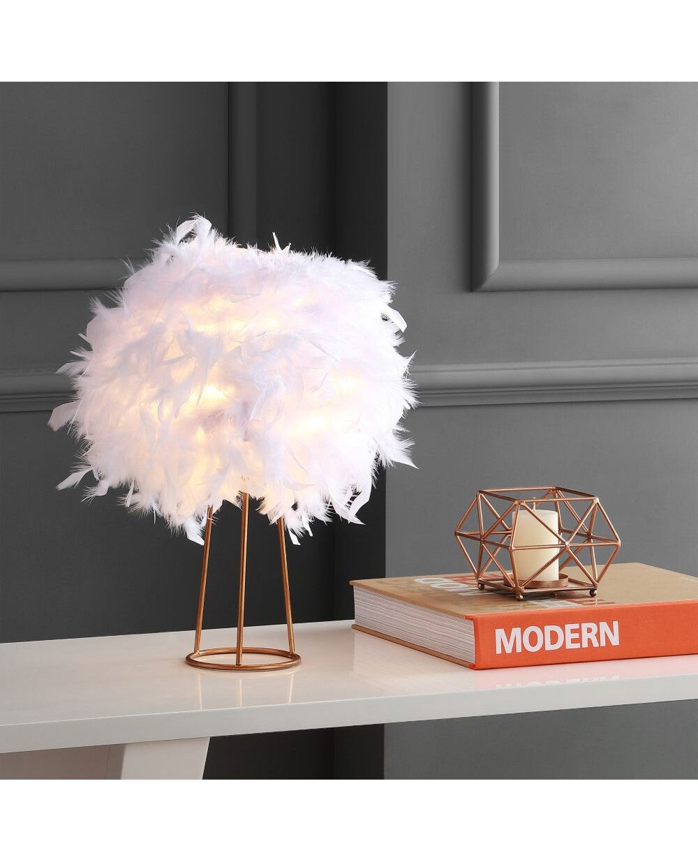 Light as air, this chic table lamp is charming and contemporary adorned in white feathers. With a single bulb and brass base, the scene-stealing feather dome softens the light while retaining a contemporary aesthetic that blends well with any style of decor. And at only 16" high, its small scale is well-suited for any surface.