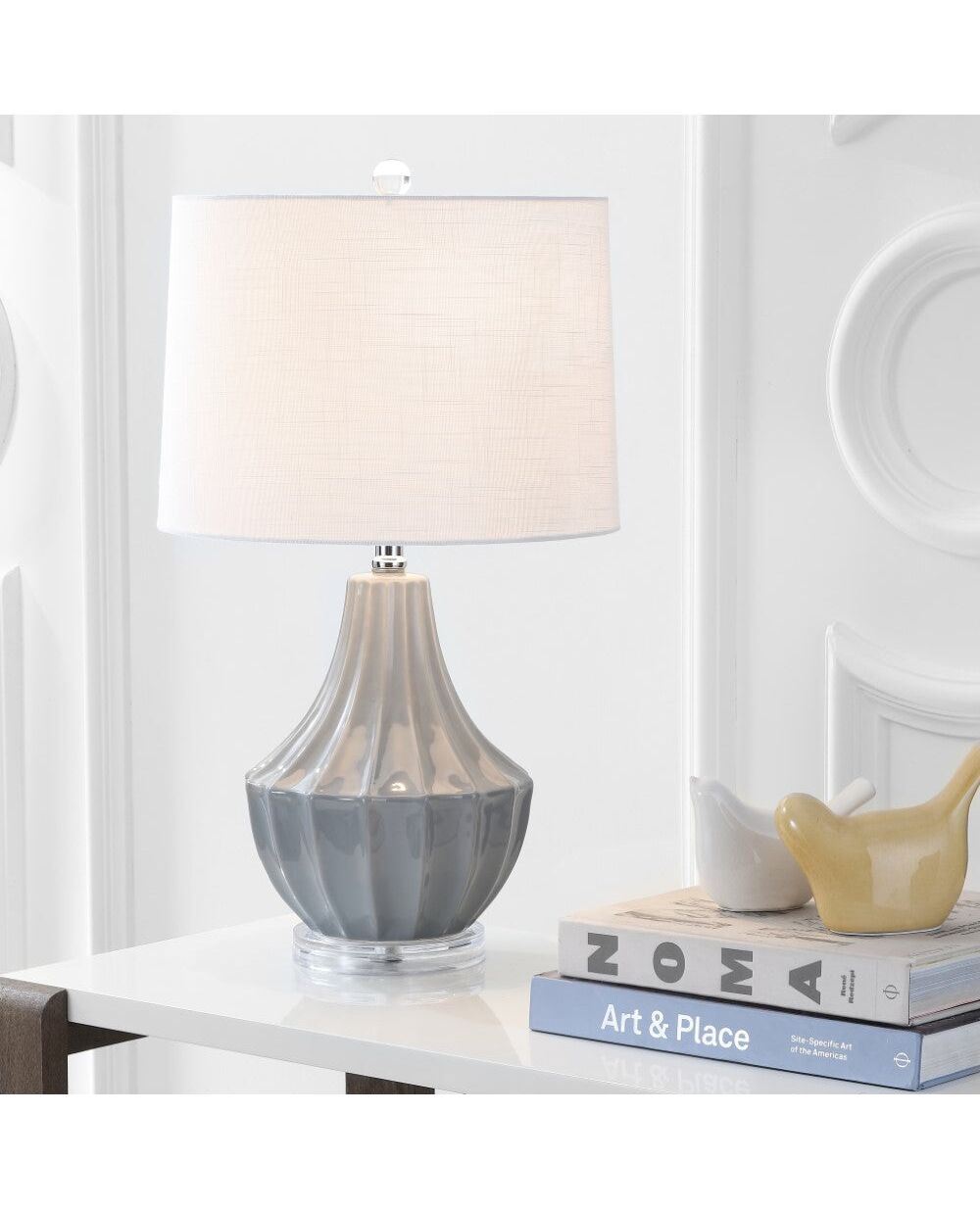 Create an inviting and stylish entertaining space with this fun ceramic gourd table lamp. A combination of a quirky pear shape and classic Roman fluting make it the perfect accent for a variety of decor styles. Topped with a drum lampshade and crystal finial to complete the look, the style extends all the way to the plug with a silk-wrapped cord.