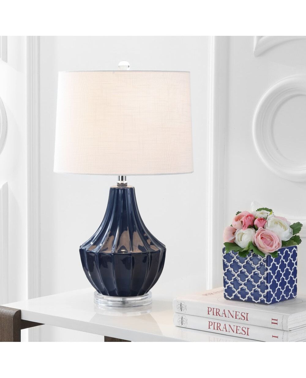 Create an inviting and stylish entertaining space with this fun ceramic gourd table lamp. A combination of a quirky pear shape and classic Roman fluting make it the perfect accent for a variety of decor styles. Topped with a drum lampshade and crystal finial to complete the look, the style extends all the way to the plug with a silk-wrapped cord.