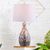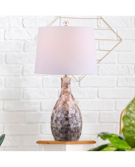 The elegantly curved base of this nearly 27" table lamp is carefully adorned with a mosaic of square capiz shell tiles and chromed accents. A white linen shade balances the look while a silk-wrapped cord provides style all the way to the plug. You'll love how the shells reflect the warm glow of the bulb when illuminated and their many shades of natural beauty from ivory to bronze.