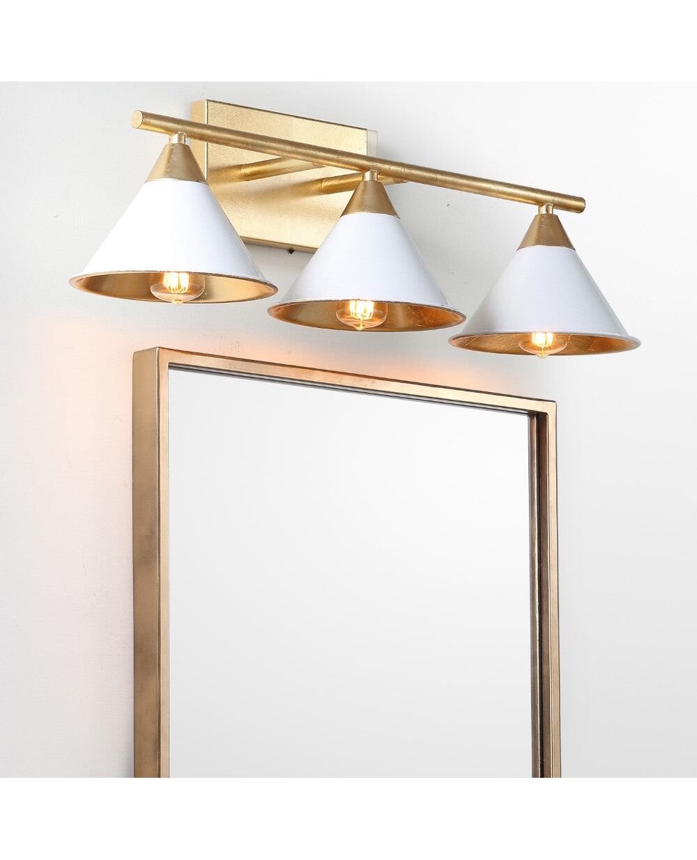 Perfect for above a mirror, this triple light sconce or vanity lighting is a contemporary touch that would add style to a variety of spaces. White metal shades and gold leaf accents pair well for a modern update to your powder room or master bath. The plastic cord is easily connected to your home's electrical grid by a licensed electrician.
