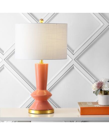 This lamp's angular shape and fresh coral color will add snappy style to your mid-century modern interior. Two lamps would make the perfect pair for a bedroom, living room, or entry console. The retro shape adds a vintage look, and gold fittings satisfy your inner Maximalist. Includes an energy-saving LED bulb.