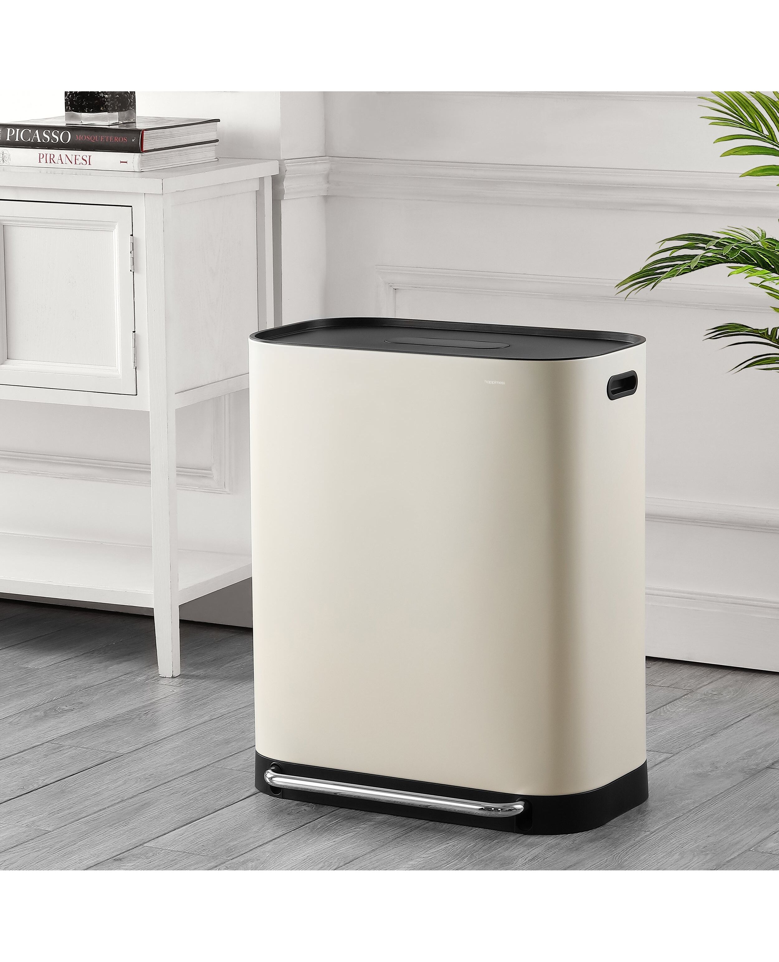 Our sleek, modern trash can combines quality construction with minimalist-style oval handles and a flat top. Tall, narrow design fits easily into any kitchen or office. Two removable liners let you sort trash and recycling, while an extra side bin collects kitchen scraps. Durable steel pedal-bar lets you dispose of trash hands-free.