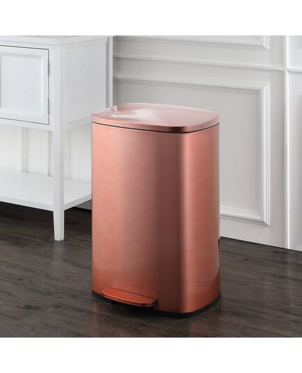 This rectangular 15-gallon trash can is the perfect solution for the family or office in need of top-of-the-line functionality. Featuring a profile hinge and rectangular silhouette -- its sleek silhouette allows it to sit close to a wall or cabinet. It's design features don't end there -- its finished in fingerprint-resistant brushed stainless steel, features a step-on mechanism that allows for smooth openings, and has a removable plastic liner that makes bag changes a cinch. For a limited time, get a matching, smaller 1.3 gallon step-pedal trash bin FREE with your purchase of this style.