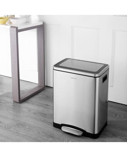 Maximize space, minimize waste with a step can that serves as both trash and recycle bin in one. Its slim design features a durable steel step and soft-closing lid. A double bucket interior houses separate bins for recyclables and for trash. Easy-lift handles on each side, and easily removable liners means each bin is always clean, fuss-free and convenient to empty. Compatible with most kitchen-sized trash bags.