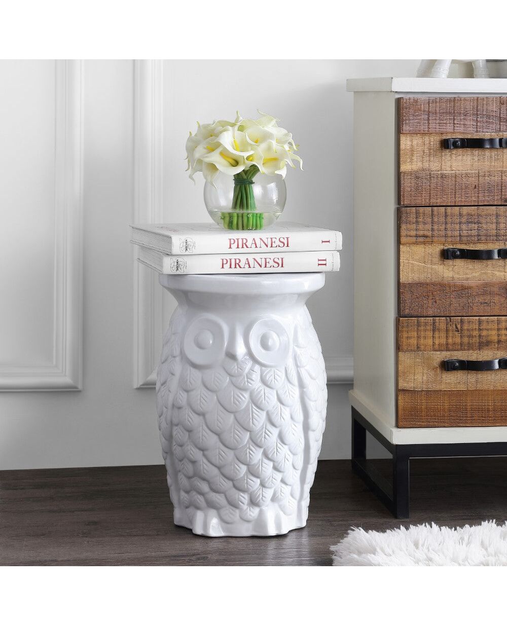 Your favorite mid-century ceramic owl stool is back - in a larger size, with a modern, bright white glaze. Use it indoors or out as a cocktail table, garden seat, or plant stand. At almost 18" tall, he's a groovy little table for the living room, bedroom, bathroom, or on the porch.