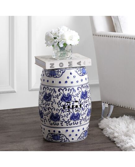 Our drum-shaped ceramic Chinese garden stool is decorated in a banded design with Lotus flowers. Timelessly chic, blue and white Chinoiserie garden seats are loved by Maximalists and Hollywood Regency fans alike. Use them indoors or outside as a cocktail table, garden seat, or plant stand.