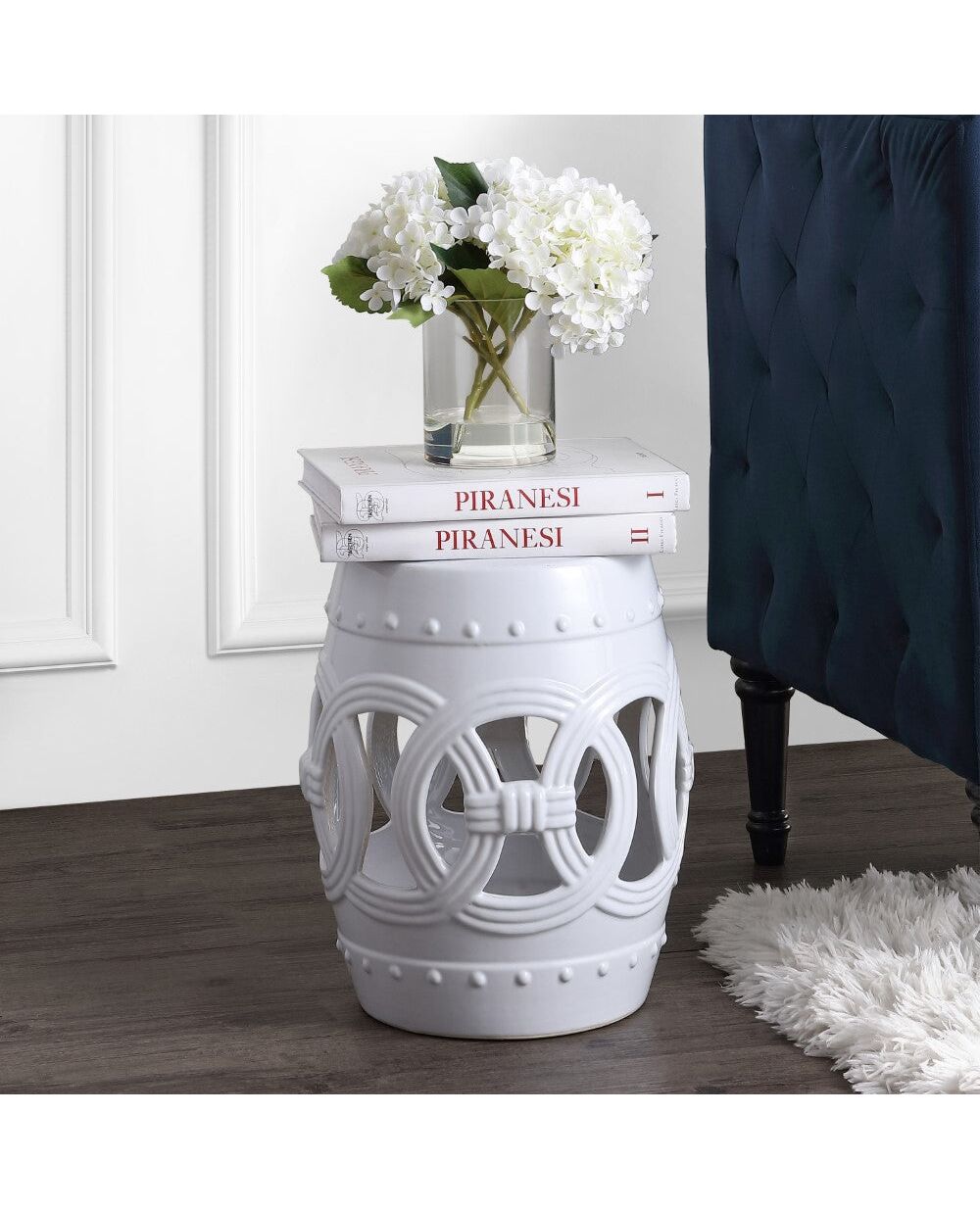 Our drum-shaped ceramic Chinese garden stool brings good fortune with a central band of lucky coin symbols. Chinoiserie garden seats are loved by traditional design fans, but our solid navy glaze gives this stool a modern touch. Use it indoors or outside as a cocktail table, garden seat, or plant stand.