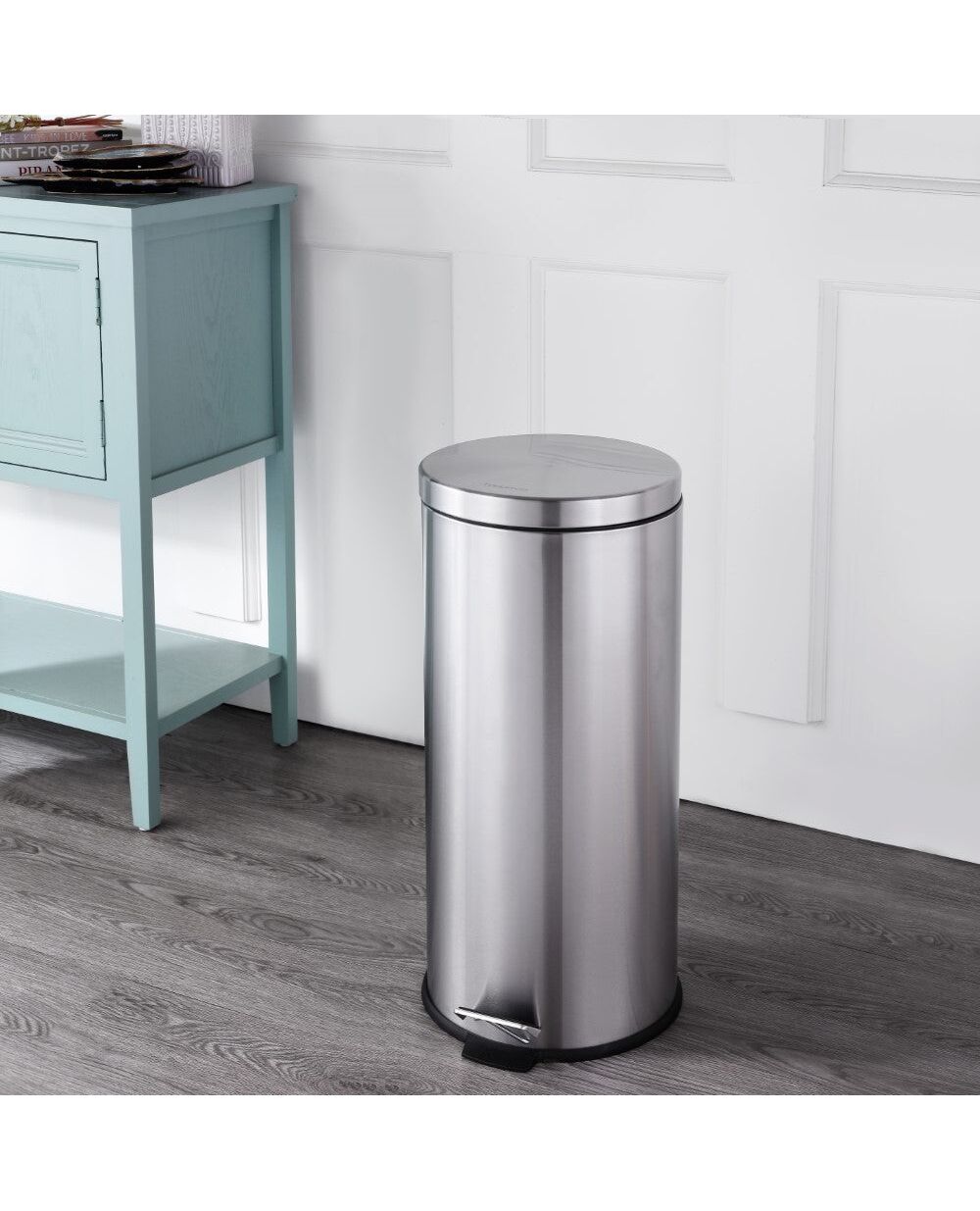 Our round 8-gallon trash cans are an excellent addition to any home or office. Featuring a profile hinge that allows it to sit close to a wall or cabinet, it's finished in brushed stainless, a fingerprint resistant surface. As good as it looks, it's just as functional -- the step-on mechanism allows for a smooth opening and the removable plastic liner makes bag changes a cinch. For a limited time, get a matching, smaller 1.3-gallon step-pedal trash bin FREE with your purchase of this style.