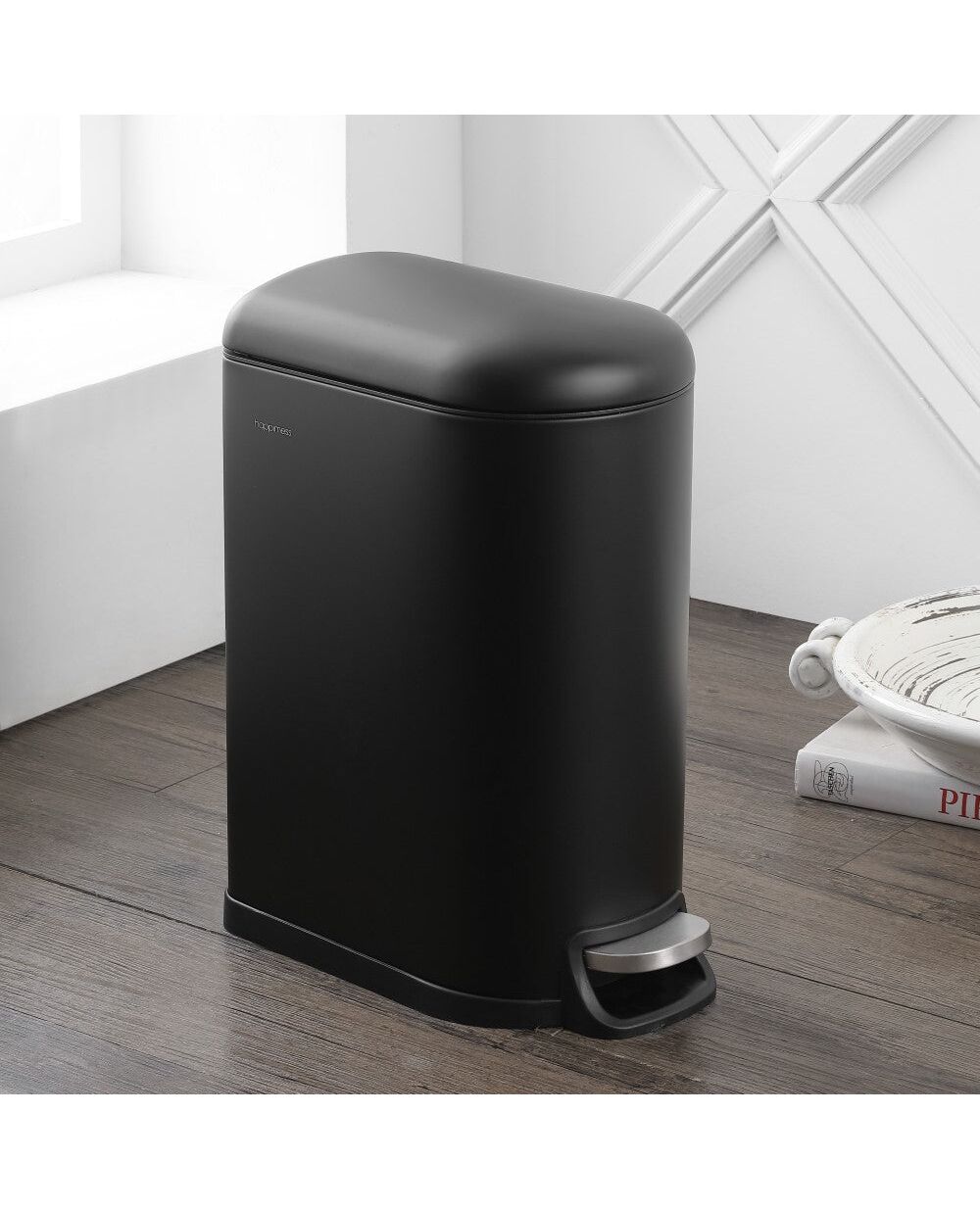 Our medium-sized trash can combines quality construction with sleek, modern styling for your kitchen, bathroom, or office. The black finish is a stylish update, and the narrow shape tucks easily under a desk or vanity. Dispose of trash hands-free with the convenient step pedal.