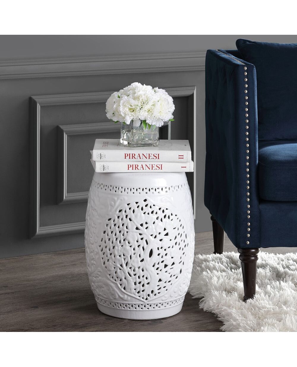 Like a classic Chinese garden seat, this ceramic garden stool has a pierced Tree of Life design and patterned border. A crisp white all-over glaze gives it a fresh, modern aesthetic. Use a pair for drinks in front of a sofa, or pull one up beside a chair.