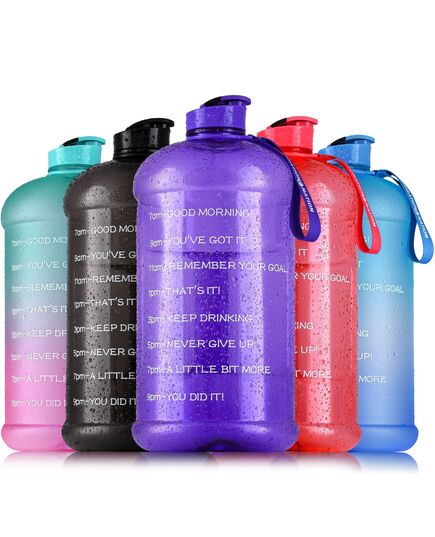 Motivational, Hourly Water Bottle Gallon - Our motivational water bottle is printed with motivational quotes & time slots to encourage you to drink the amount of water your body needs every day. This large water bottle allows less refills & more water intake.